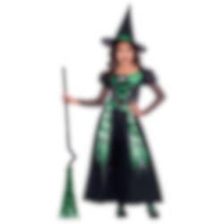 Spider Witch Maskeraddräkt inkluderar en svart klänning med gröna detaljer och en häxhatt. Strumpor, kvast och skor ingår ej. Dräkten är tillverkad av 100 % polyester och finns i en storlek som passar på barn mellan 6 år till 8 år. Ska handtvättas och dropptorkas.