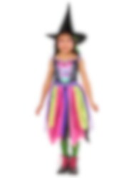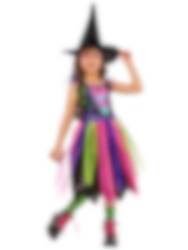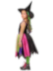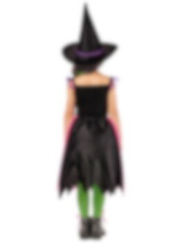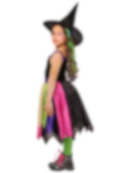 Låt barnet förvandlas till en magisk och färgsprakande liten häxa! Denna lekfulla maskeraddräkt består av en glittrig klänning i starka färger som rosa, lila och limegrönt, med flera lager tyll som ger härlig volym. Häxhatten som ingår gör looken komplett och redo för Halloween.