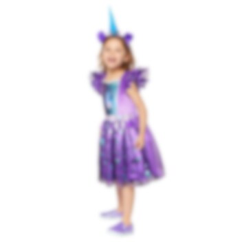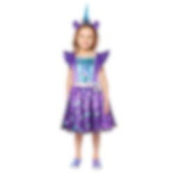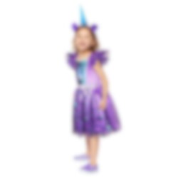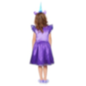 My Little Pony Izzy Moonbow Maskeraddräkt inkluderar en färgglad klänning och ett diadem. Dräkten är tillverkad av 100 % polyester. Skor ingår inte.
