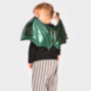 Gröna drakvingar som blir ett coolt tillskott till din maskeraddräkt för Halloween. Tillverkade av 100 % polyester med en stålram i vingarnas övre kant för extra stabilitet. Vingarna har elastiska axelband och en snygg grönmetallic finish. Passar barn från ca 2 till 14 år.