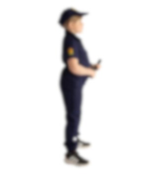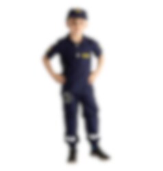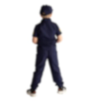 Ingår gör även ett par matchande mörkblå byxor med resår i midjan och reflexremmar, ett enklare bälte med silverfärgat spänne och en matchande poliskeps med polissymbol på.