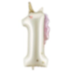 En magisk folieballong i form av siffran 1 med vacker enhörningsdesign. Perfekt till ett 1-årskalas eller som del av en större sifferkombination på enhörningstemat.