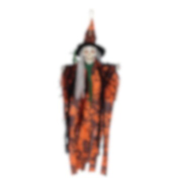 Skapa en kuslig stämning till Halloween med denna hängande häxa! Figuren är 60 cm lång och har ett skrämmande utseende med hatt, hår och slitna kläder som fladdrar när den rör sig. Perfekt att hänga vid entrén, i ett träd eller som en del av dina inomhusdekorationer för att överraska både gäster och bus-eller-godis-besökare.